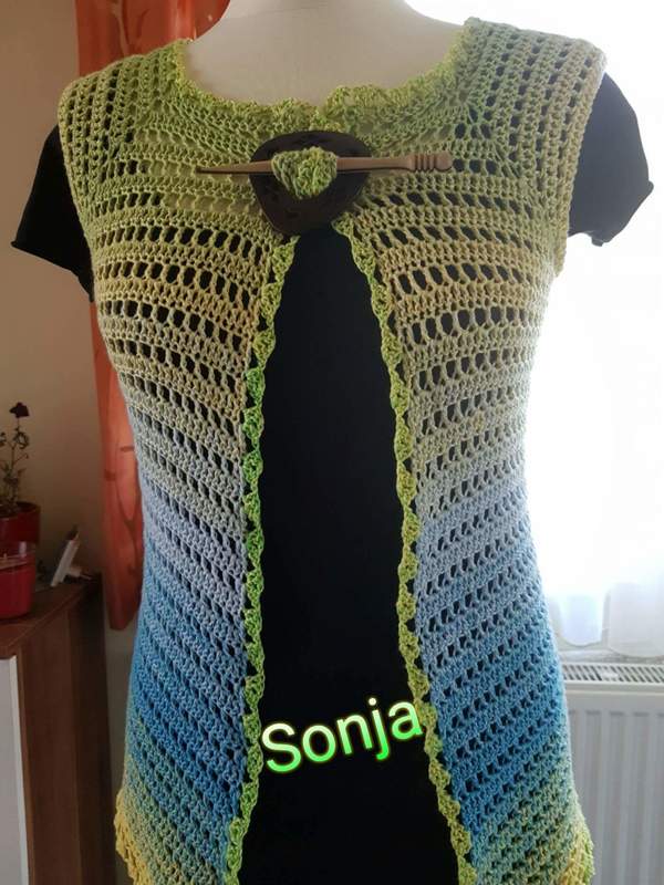 Ihr häkelt einfach von oben, bis eure Arbeit die gewünschte Größe erreicht hat, und unterm Arm zusammengefasst werden kann. Weitere mögliche Zunahmen sind in der Anleitung erwähnt.