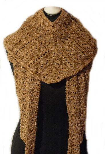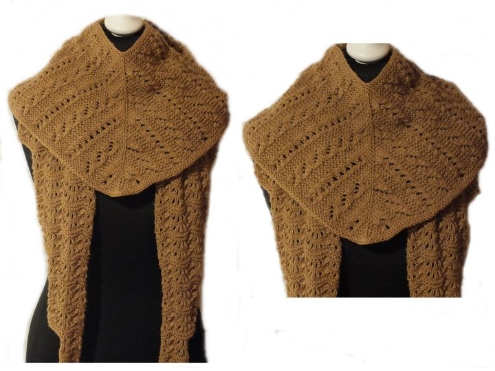 Das Tuch wird in drei Teilen gestrickt. Zuerst der Mittelteil, der mit 2 kompletten Strickschriften nachgestrickt werden kann. Das Muster erfordert Aufmerksamkeit, da auch in den Rückreihen auf die Maschen geachtet werden muss. Danach wird beidseitig noch ein Flügel angestrickt, der in einem Wellenmuster gestrickt wird.