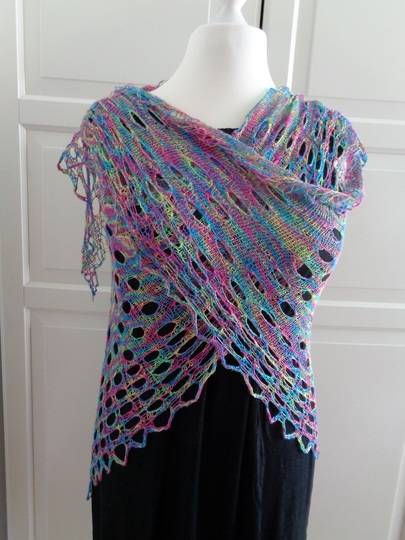 Das seidige Material eignet sich ganz besonders für dieses leichte Sommertuch, man kann aber auch anderes Material verwenden. Die Anleitung ist auch sockenwolletauglich! Ein Farbverlaufsgarn in Ihren Lieblingsfarben kann ebenso verwendet werden. Achten Sie dabei auf die Nadelstärke und die Lauflänge, die Größe des Tuches kann sich dadurch ändern. Das Muster kann aber der Garnlänge angepasst werden. Und schon wird aus dem Sommertuch ein winterwarmes. Die Anleitung ist in Worten verfasst und Reihe für Reihe erklärt.