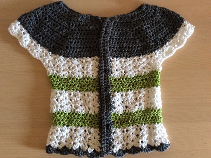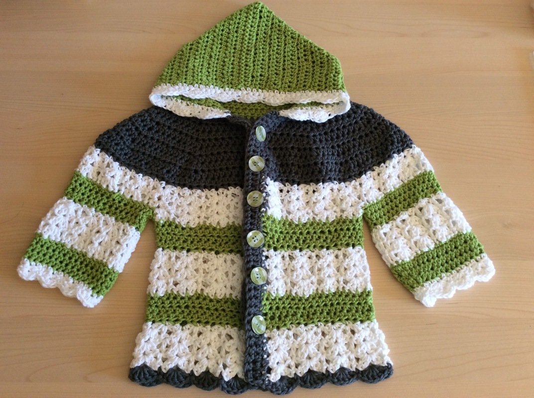 Die Jacke wird ohne Naht von oben nach unten gehäkelt, man kann sie mit Kapuze, aber wer lieber ohne hätte,