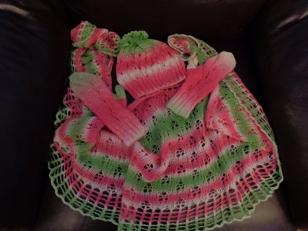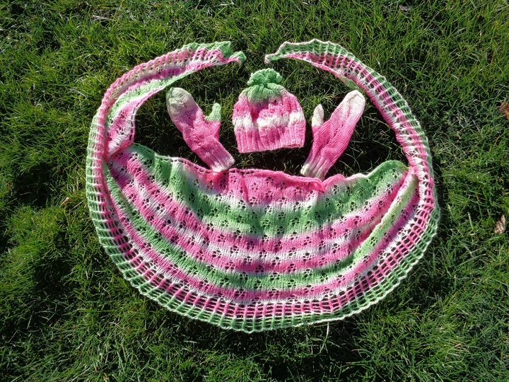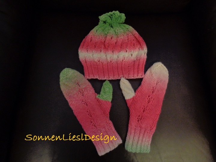 Für das ganze Set wurden zwei Knäuel Zauberball von Schoppel zu 420 m Lauflänge mit einer Rundstricknadel 4,5 und einem Nadelspiel 4,0 mm verarbeitet. Sie können alternativ auch andere Farben verwenden. Achtung: Bei anderen Garnen kann sich die Größe ändern!