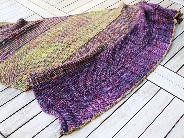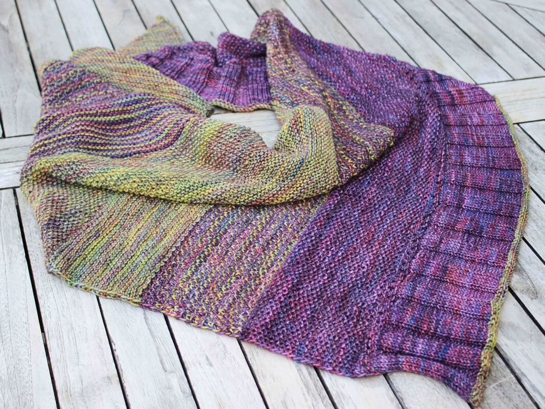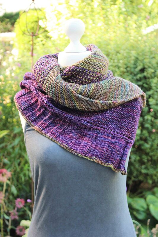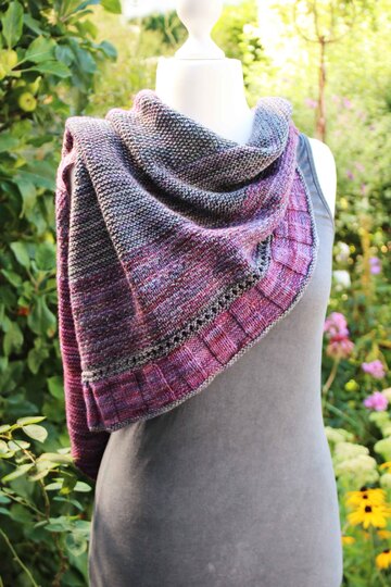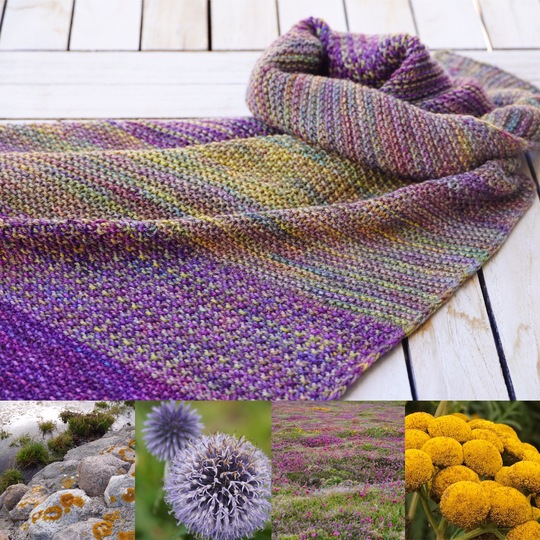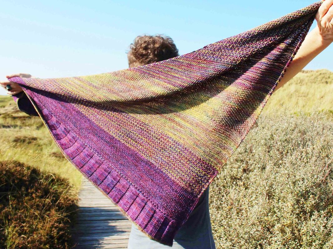 Wenn im Frühjahr der Ginster blüht, im Sommer die Gräser und im Spätsommer die Heide ganze Landschaften in ein violettes Blütenmeer verwandelt, zeigt uns die Natur ihre faszinierende Farbpalette – und inspiriert mich immer wieder aufs Neue. Im Dreieckstuch SOLVEIG wird dies ganz spielerisch aufgenommen: Einfache Strukturmuster in Kombination mit den Farbtönen der Heidelandschaft bilden das Grundgerüst für dieses Tuch und durch aufeinanderfolgende Musterstreifen und das Farbspiel des handgefärbten Garns entstehen schöne Farbübergänge.