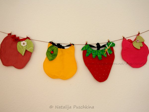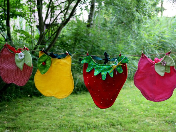 Der Sommer kommt und Dein Baby braucht neue Lätzchen in Früchteform Apfel, Erdbeere, Himbeere, Birne.