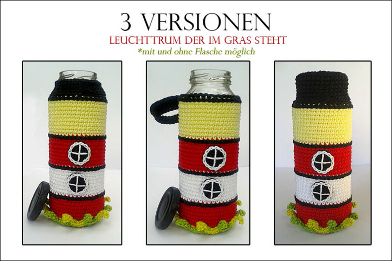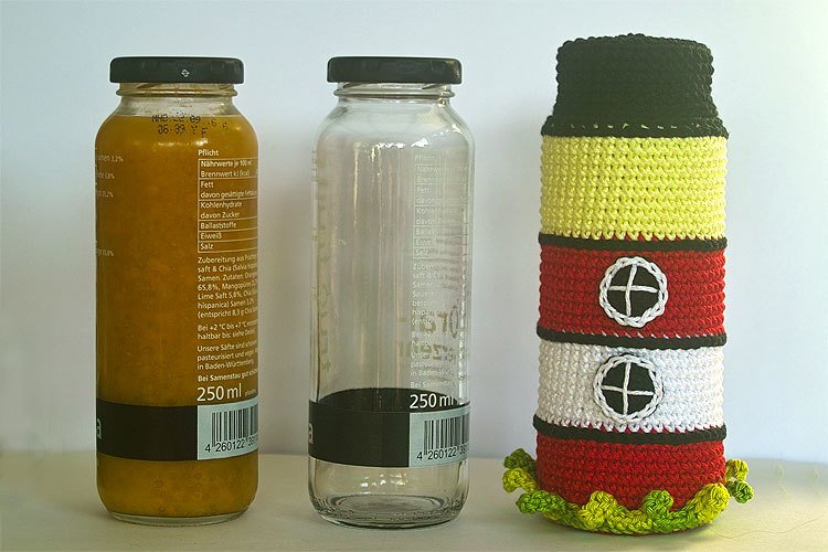 Die Anleitung ist für eine Glasflasche mit 250 ml Fassungsvermögen geschrieben Die verwendete Glasflasche für den Leuchtturm ist eine true fruits Smoothie-Flasche. Bild der Flasche ist in Anleitung. Man kann aber auch die Flasche durch einen Karton ersetzen und den Boden 2 mal häkeln und zusammennähen.