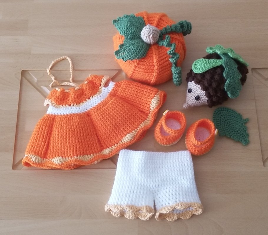 Die PDF beinhaltet die Häkelanleitung für das Kleid, den Kürbishut, die Schuhe, das Höschen sowie das Igelchen und die Blätter. Die Anleitung für die Stola ist nicht dabei.
