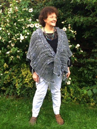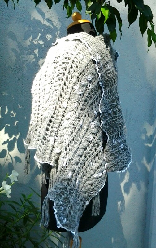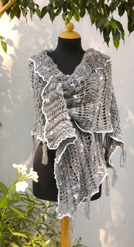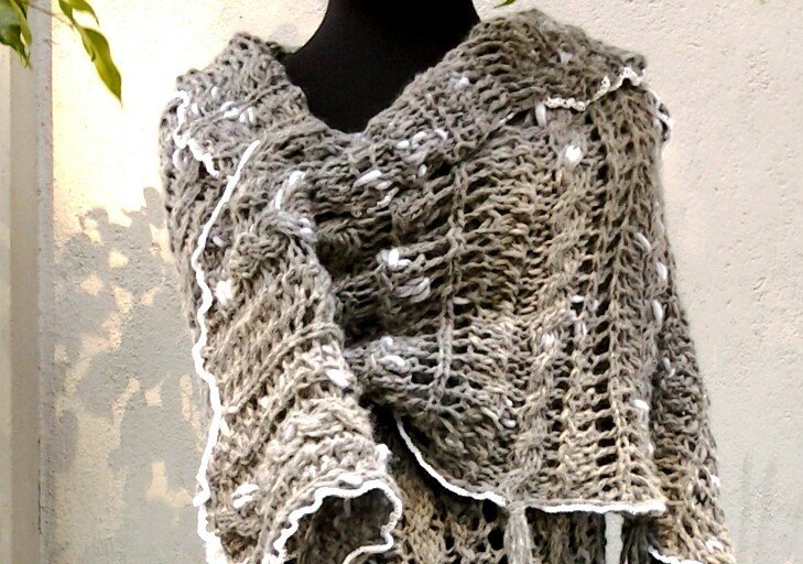 Das Schultertuch in der Form einer rechteckigen Stola ist in einem Lace-Muster locker gestrickt, der feine Häkelrand aus weißer Baumwolle gibt ihm einen nostalgischen Akzent. An einer Seite hat es ein Loch, das eine nützliche Anwendung beim Verschließen hat.