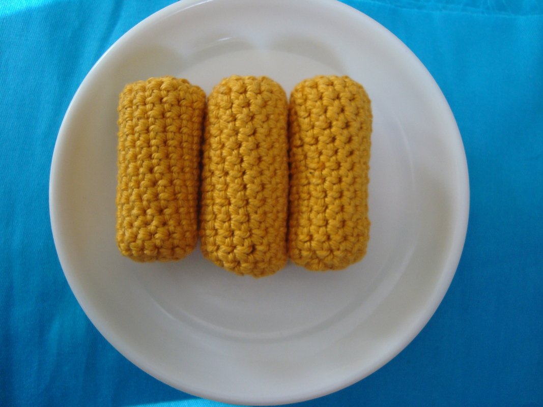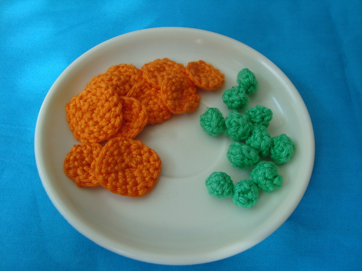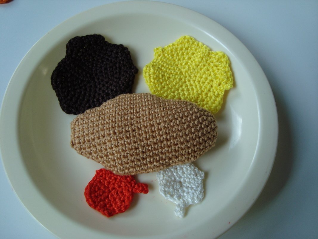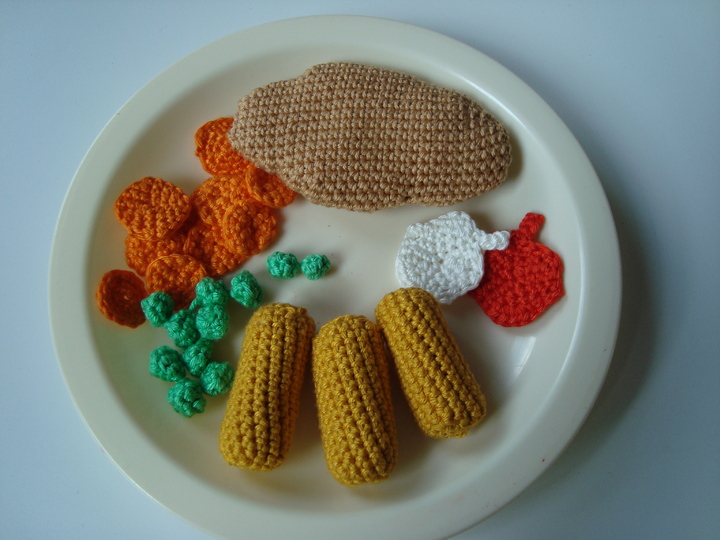 Ich biete hier eine selbstentworfene Anleitung zum Häkeln eines Menüs für die Kinderküche und/oder den Kaufladen, bestehend aus: