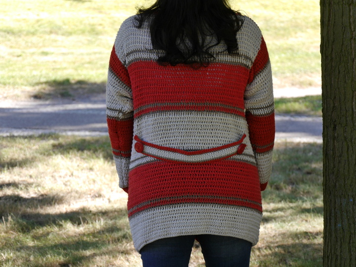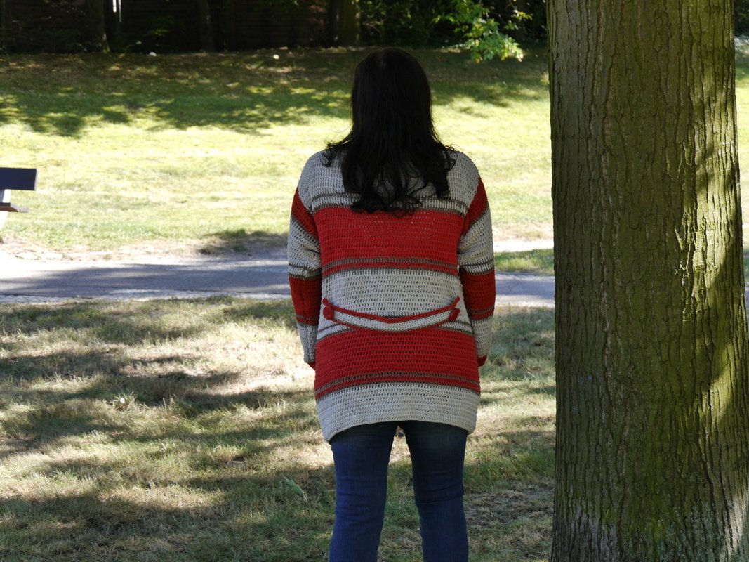 Raffinierte Details wie Taschen und ein Gürtel am Rücken peppen die Strickjacke auf.
