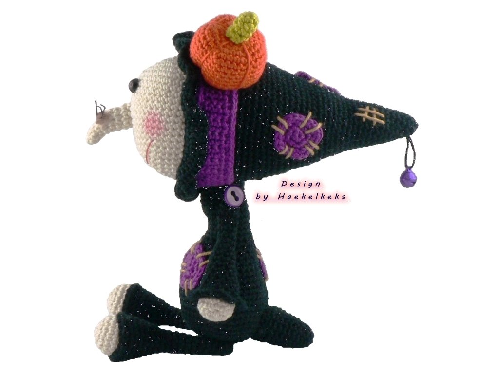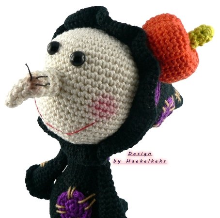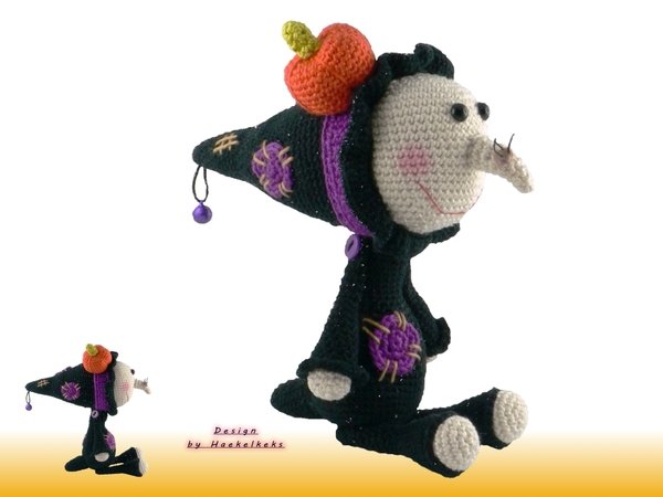 Die endgültige Größe ist je nach Garn, Nadelstärke und Häkelfestigkeit verschieden. Der Hexen-Tropfi wird sitzend (incl. Kürbis) bei festem Häkeln ca. 17cm hoch.