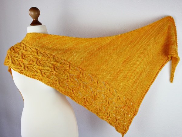Das asymmetrische Dreieckstuch Sunflowers beginnt mit nur wenigen Maschen und wächst durch seitliche Zunahmen gleichmäßig zu einem großzügigen, elegant fallenden Tuch heran.