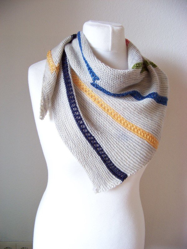 Ihr habt noch Wollreste in eurem Strickkorb und wisst nicht genau, was ihr damit anfangen sollt. Hier stelle ich euch ein Projekt vor, das Ideal dafür wäre. Ein bisschen Lochmuster, etwas Interasientechnik und für den Fernsehabend der kraus rechts gestrickte Teil. Es ist immer interessant, dieses Tuch zu stricken.
