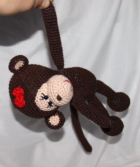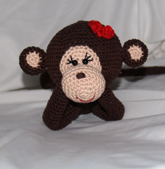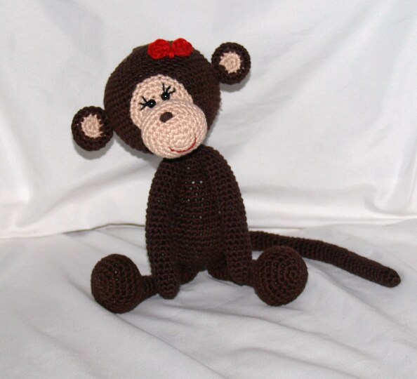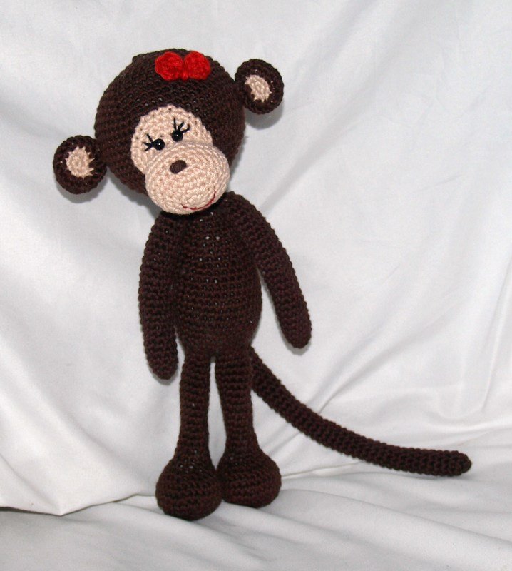 Äffchen Lulu wird stehend bis zu ca. 23cm groß. Je nach Wollstärke kann sie größer oder kleiner werden.