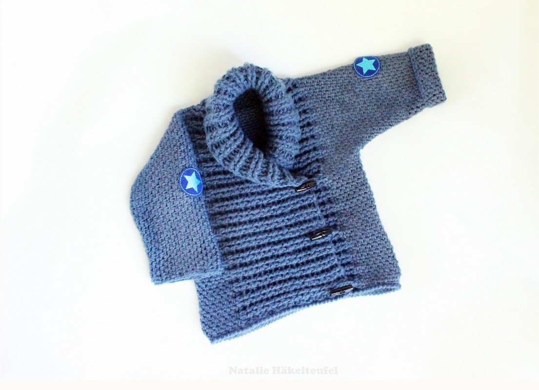 Jacke: Katia Basic Merino, 52% Merino, 48% Acrylic, 50gr./120m., Farbe Denim, für Größe 50-56: 200 g und jeweils 50 g mehr für jede weitere Größe, Alternative: Lana Grossa COOL WOOL Big, 100 % Schurwolle, Lauflänge: ca. 120 m / 50 g, Häkelnadel Nr. 3 und 3,5, Knöpfe, 3-5 St. (abhängig von der Größe der Jacke).