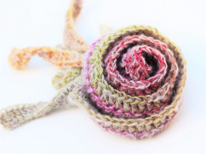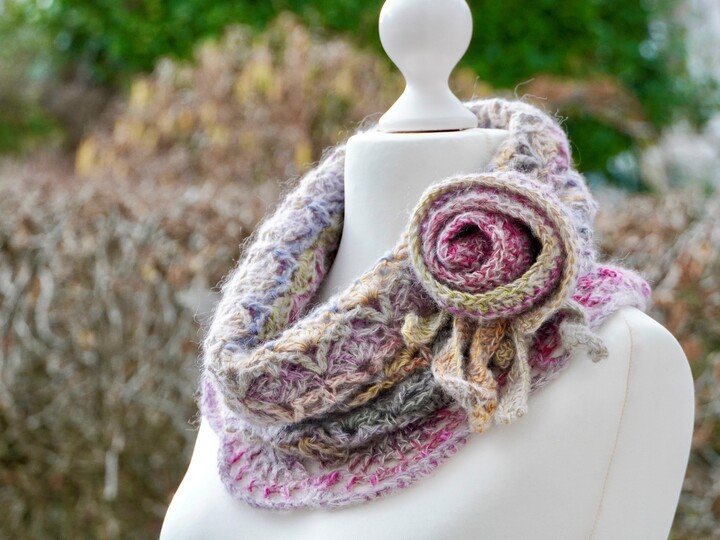 Kuschlig, fröhlich, chic, romantisch - und gut gegen Winterblues...! Loop JORDIS wird in einem einfachen Fächermuster gehäkelt. Hier wurde ein Farbverlaufsgarn mit einem unifarbenen Flauschgarn kombiniert, so wird der Loop kuschlig weich, leicht und die Farbigkeit wird etwas abgemildert. Wer es lieber einfarbig mag: Auch mit unifarbenen Garnen sieht der Loop spitze aus! Der LOOP ist einfach und schnell gehäkelt und kann sowohl nach Häkelschrift als auch nach schriftlicher Ausführung aller Runden gearbeitet werden. Die Häkel-Rose unterstreicht zusätzlich den romantischen Touch!