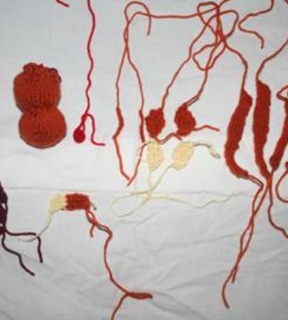 Wollreste in Hellgelb, Rot, Weiß und Schwarz