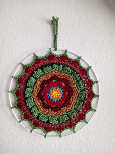 Ich biete an: Ein herbstliches Mandala, gehäkelt, in einem Drahtring Durchmesser 20 cm.