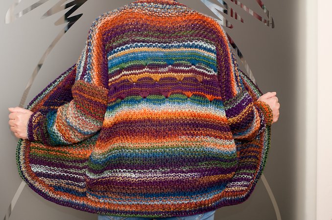 Die Jacke wird von unten nach oben in Einzelteilen gestrickt und anschließend zusammengenäht. Die Ärmelmaschen werden direkt aus den Seiten von Vorder- und Rückenteil aufgenommen, anschließend strickt man die Ärmel von oben nach unten in Reihen. Die Rippenblende wird zum Schluss einmal um alle Kanten der Jacke in Runden gestrickt.