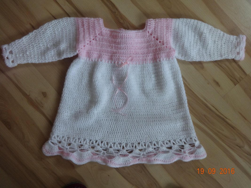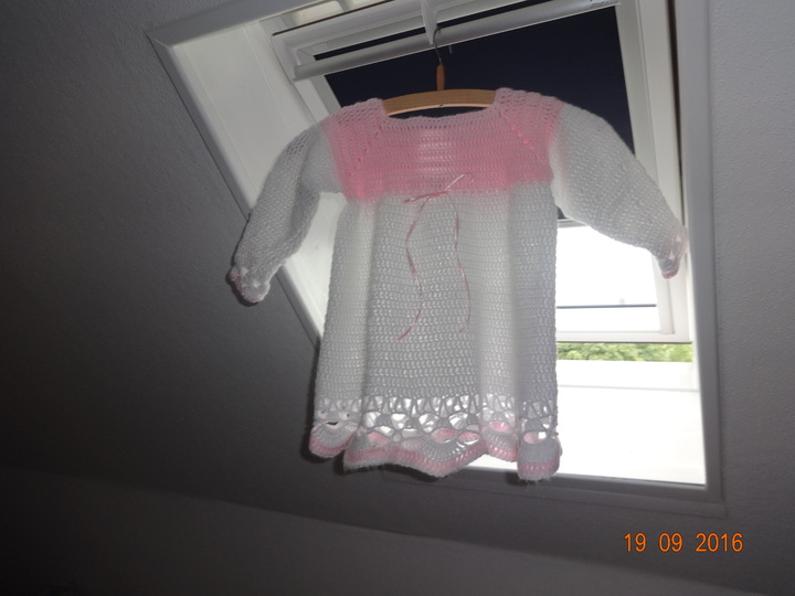 Da ich alles genau beschrieben habe , könnten es auch Anfänger die mit den angegebenen Maschen und mit einer Häkelschrift lesen über 4 Reihen auch fertigen.Das Kleidchen wird hinten mit einem Knopf geschlossen