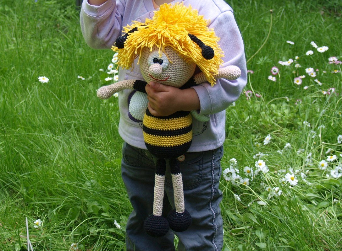 Biene Sumse wird stehend bis zu ca. 37cm groß. Je nach Wollstärke kann er größer oder kleiner werden.