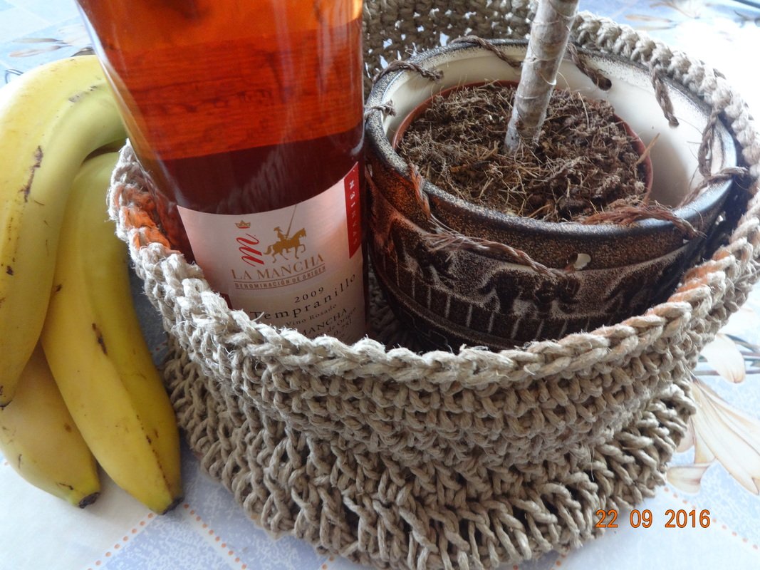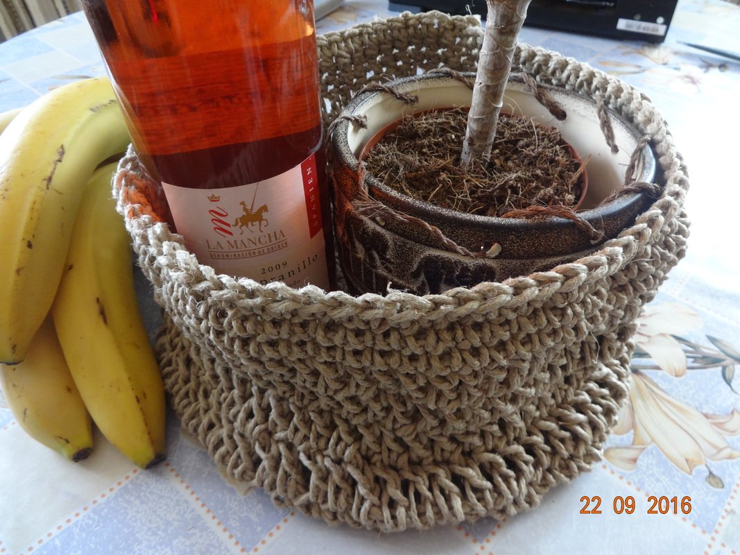 Schnell und einfach gehäkelter Korb aus ca 300 gr Paketband . Mit Häkelnadel Nr. 5