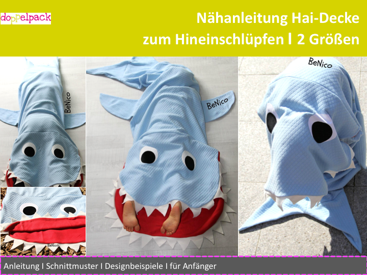 Mit Hilfe dieser Anleitung und des Schnittmusters kannst Du eine solche Hai-Decke in zwei verschiedenen Größen nähen: