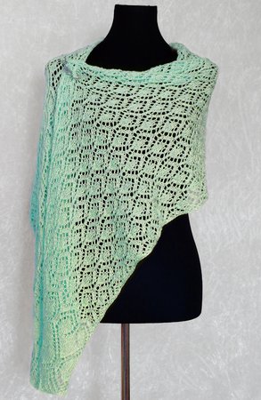 Die Stola stricken wir von der Mitte aus mit einem provisorischen Maschenanschlag (Achtung: dieser wird in der Anleitung nicht näher erklärt - bitte googeln ☺) und dann weiter in beide Richtungen. Sie kann mit allen Garnen in Lace- oder Sockenwollstärke gestrickt werden.