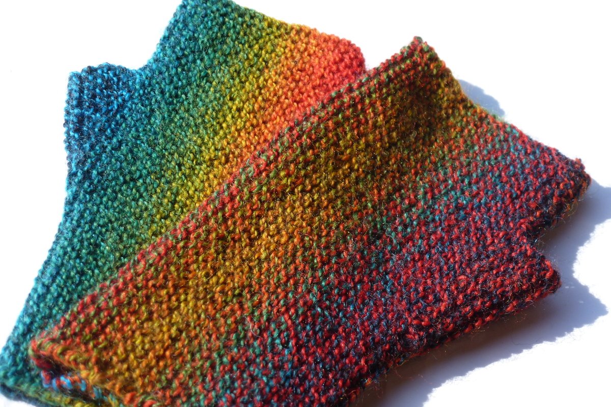 diese Pulswärmer sind der Länge nach gestrickt, nur mit rechten Maschen, die Daumenöffnung hat verkürzte Reihen, das ist aber im Strickrezept gut erklärt. Auch als ein kleines, feines Geschenk geeignet , aus bunter Wolle wirkt diese Strickart am besten.