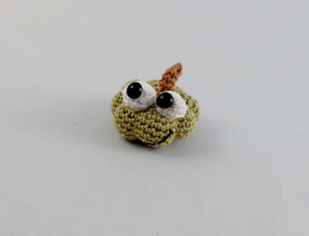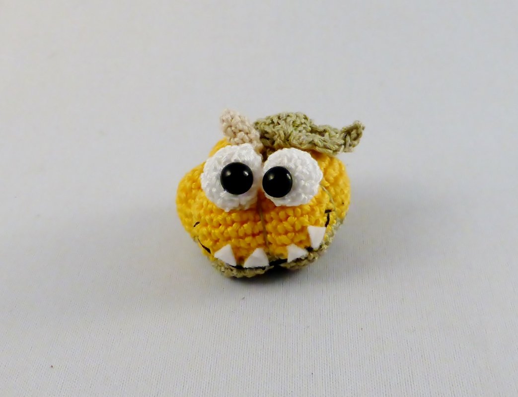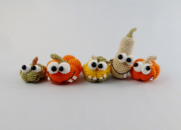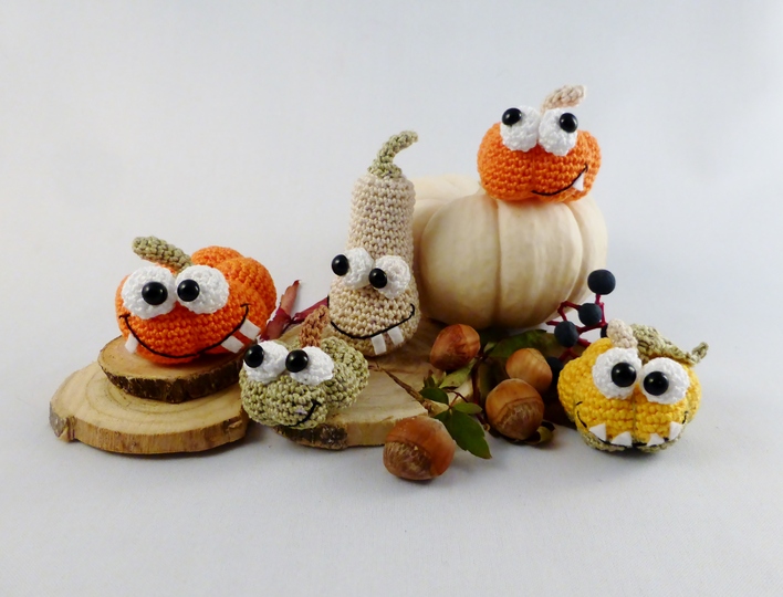 Mit einer 2.0 Häkelnadel: grosser oranger Kürbis: 5.5 cm Breite, 4 cm Höhe kleiner oranger Kürbis: 4 cm Breite, 3.5 cm Höhe Butternuss: 3.5 cm Breite, 7 cm Höhe gelb-grüner Kürbis: 3.5 cm Breite und Höhe grüner Kürbis: 3.5 cm Breite, 3 cm Höhe