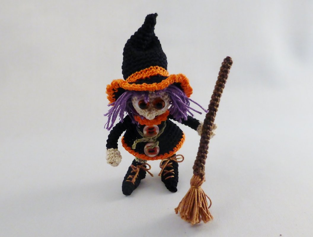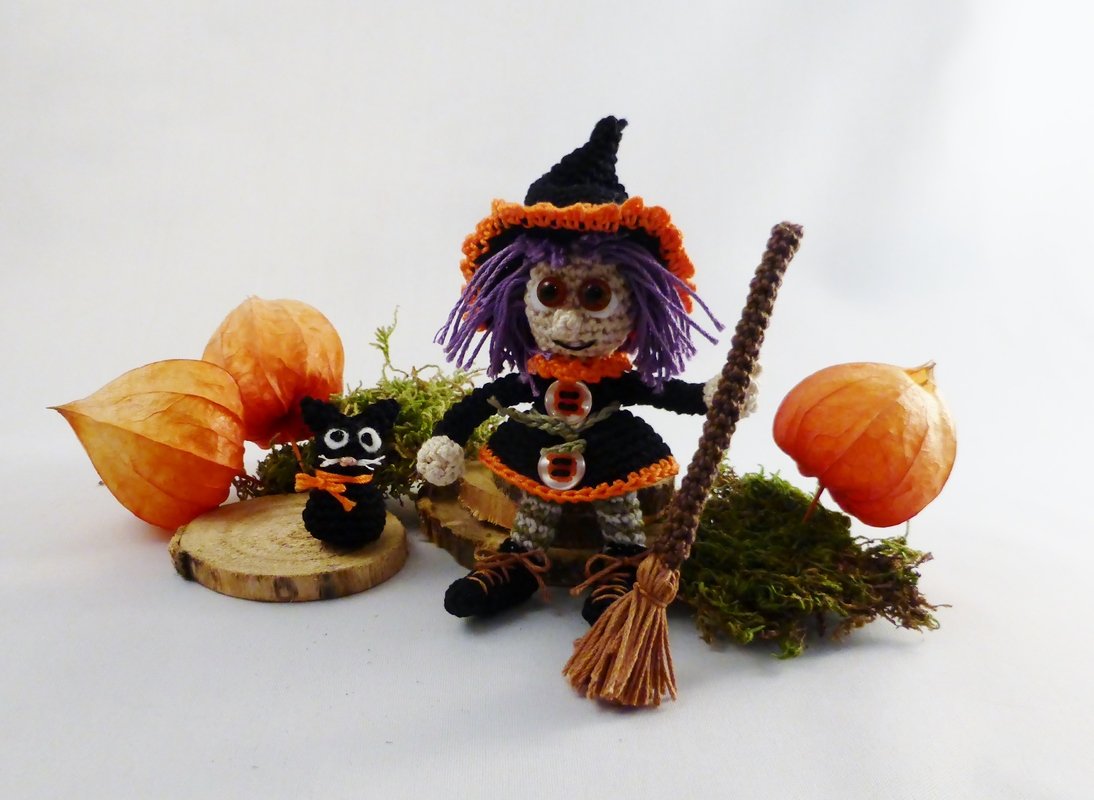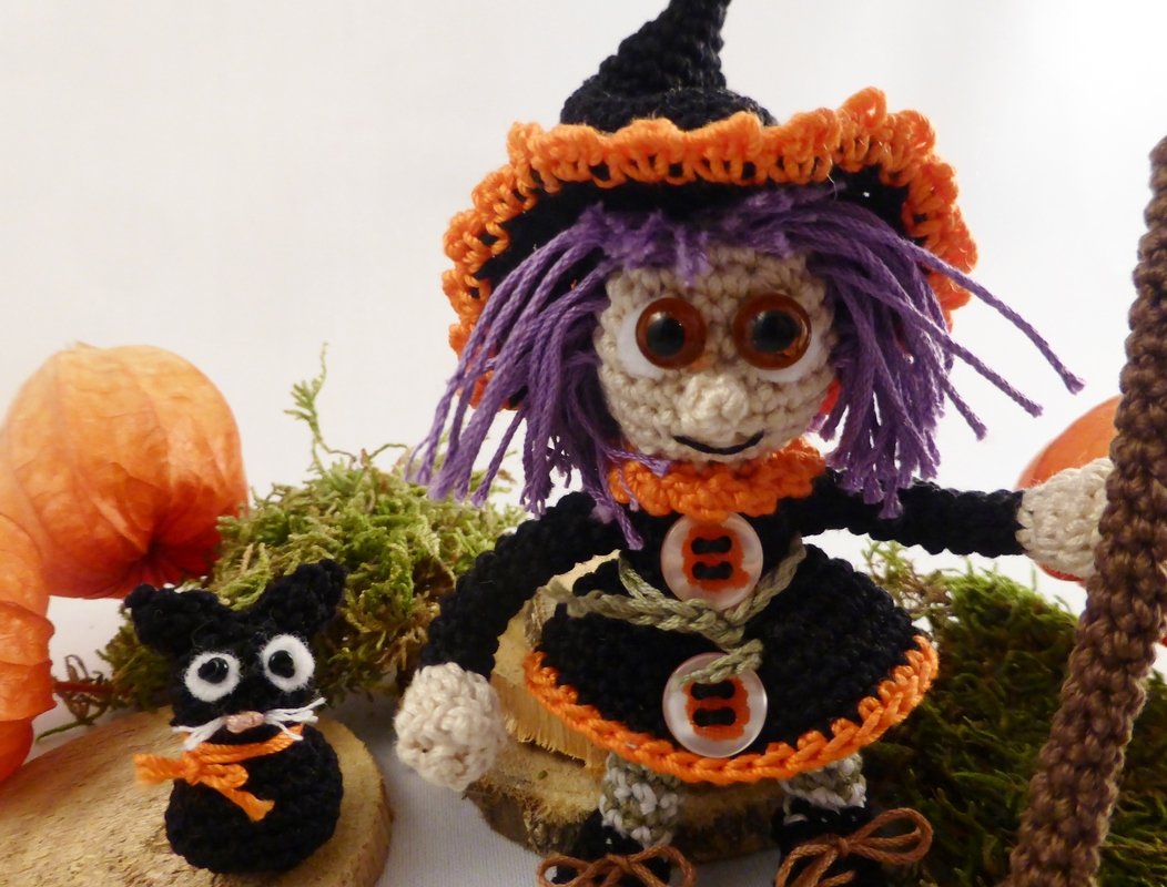 Mit einer 2.0 Häkelnadel erreicht die Hexe eine Höhe von 11 cm Mit einer 2.0 Häkelnadel erreicht der Kater eine Höhe von ca. 3,5 cm