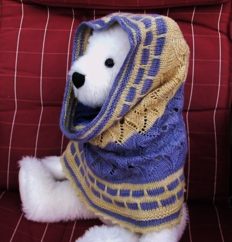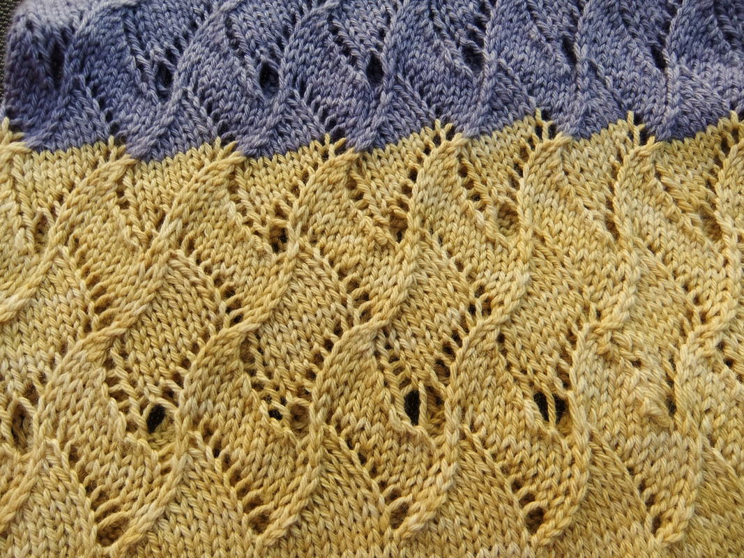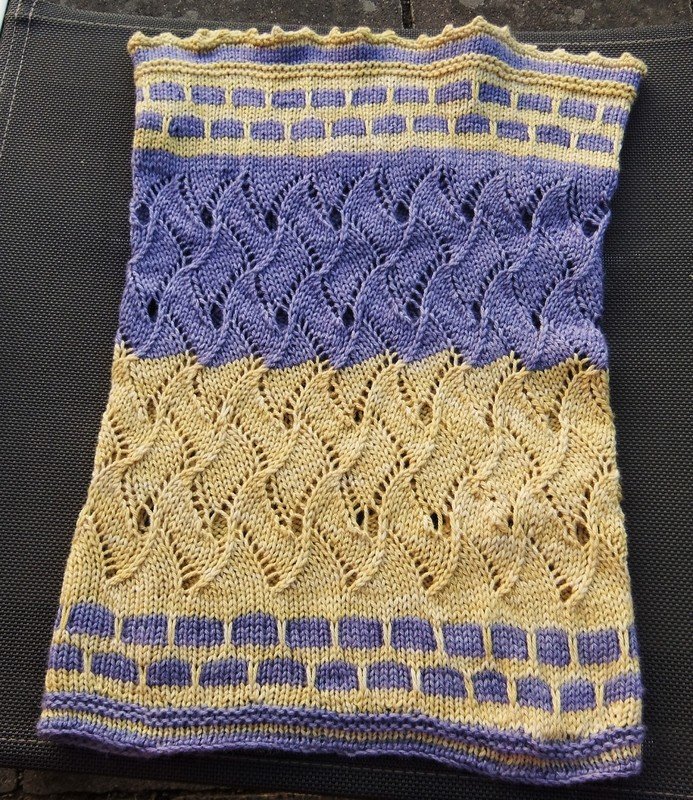 Der Cowl ist in Runden gestrickt. Er fängt mit Kraus rechts an, dann kommen Reihen mit Hebemaschen und ein leichtes Schlangenmuster. Abgekettet wird mit einem Picotrand. Das Muster sieht schwerer aus als es ist.
