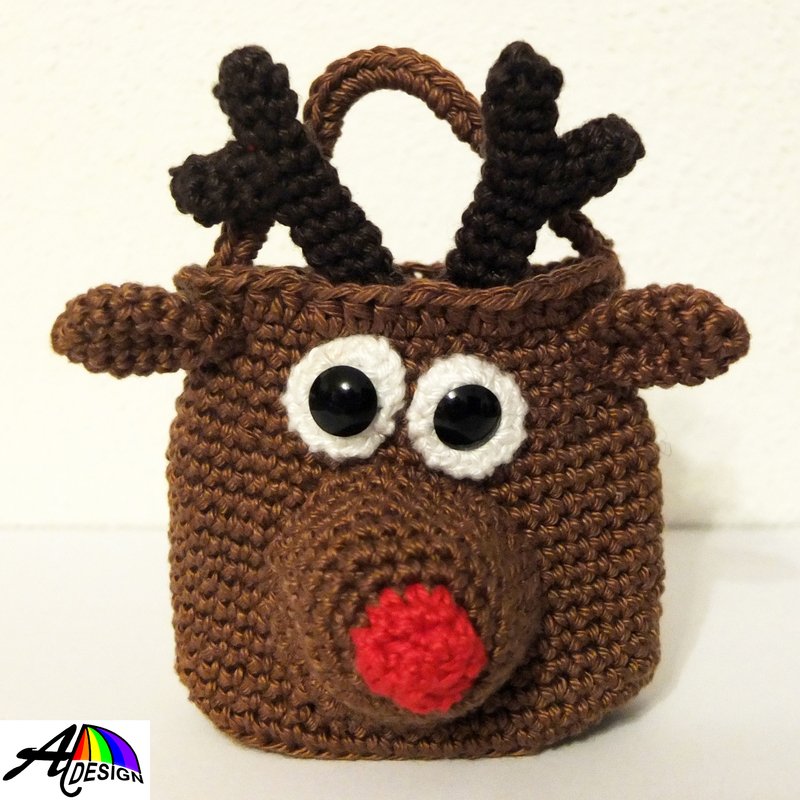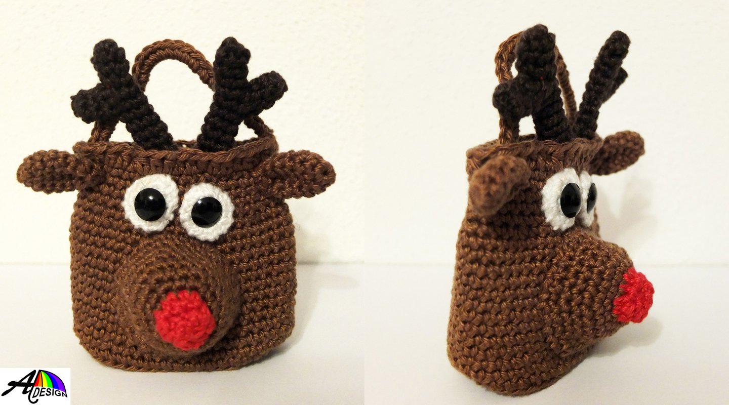 Häkelanleitung für einen Adventskalender, der aus kleinen "Rentier"-Täschchen besteht.