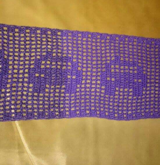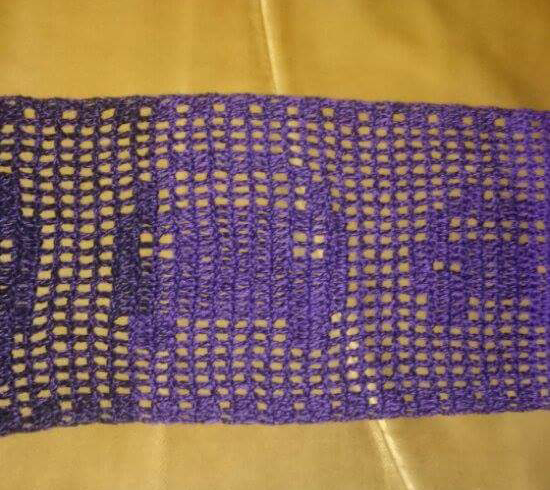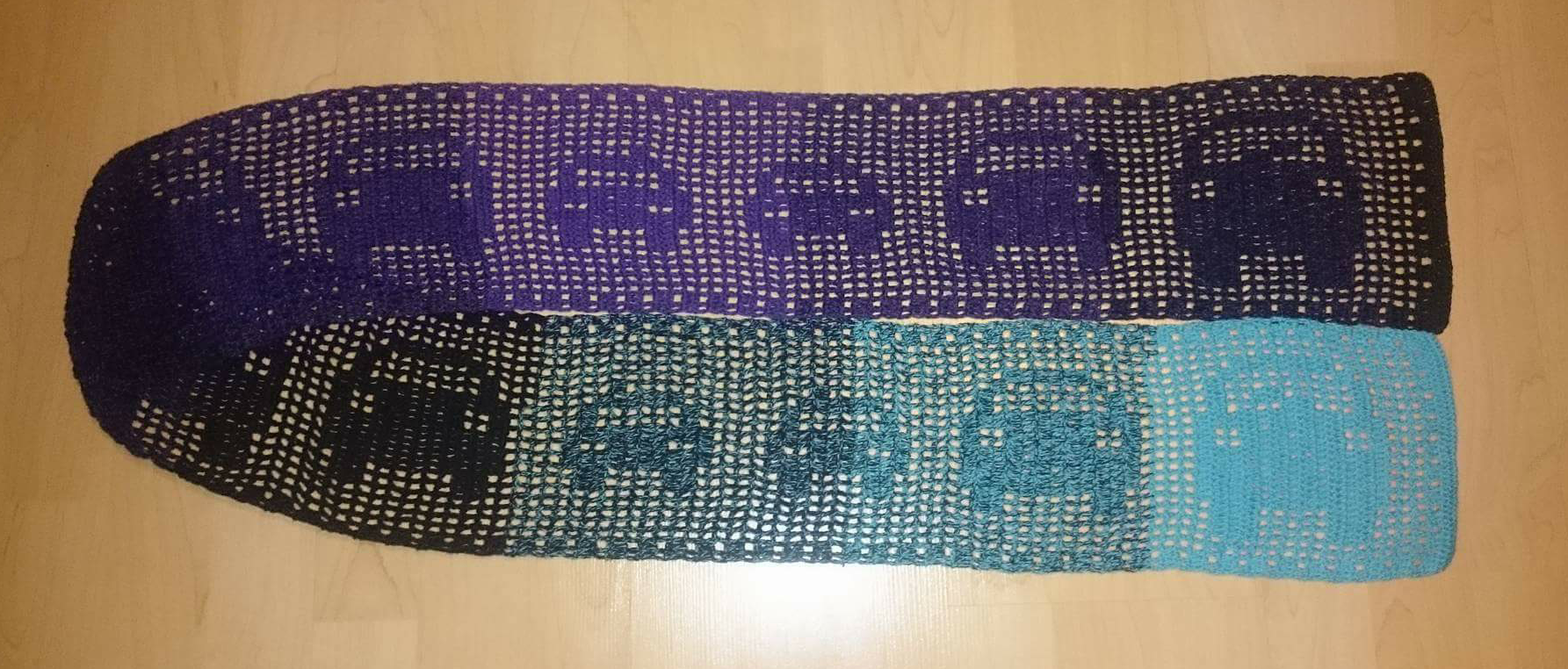 Der Schal wurde mit ca. 500 Metern 3- fach gefachtes Farbverlaufsgarn mit einer Nadelstärke 3 gehäkelt.
