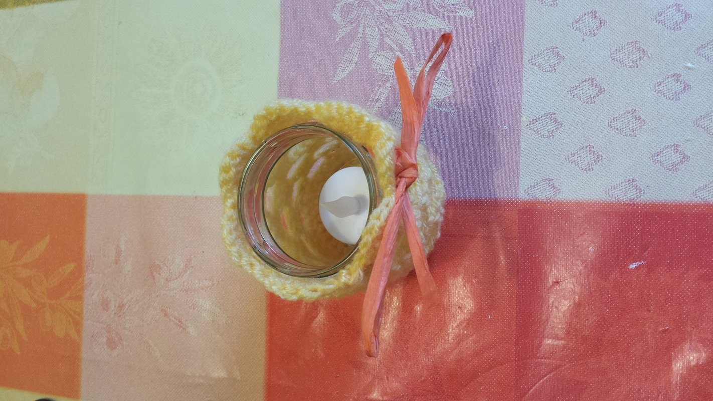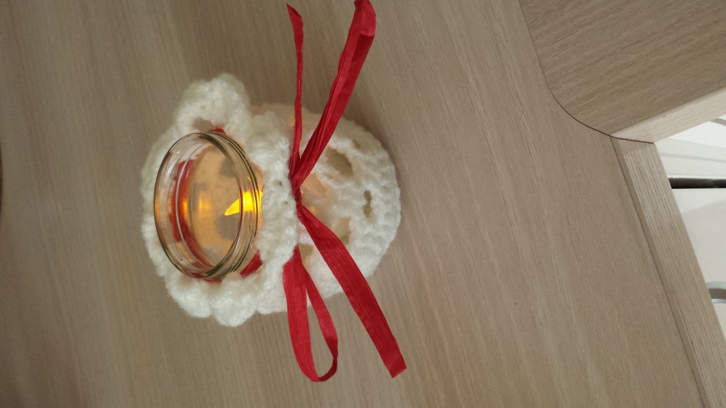 Es wird Wolle benötigt, ein Glas vom Gemüse oder Babymenü, Häkelnadel Stärke 3, ein elektrisches Teelich, 1 Meter Bastband und einen Maschenmarkierer. Die Öffnung vom Glas muss so groß sein das ein Teelicht da hinein passt .
