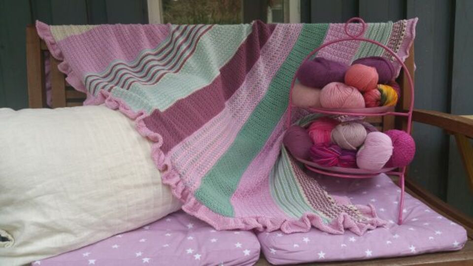 Das Tuch hat zwar fünf Farben, es wird trotzdem nur eine Farbe zur Zeit gestrickt.