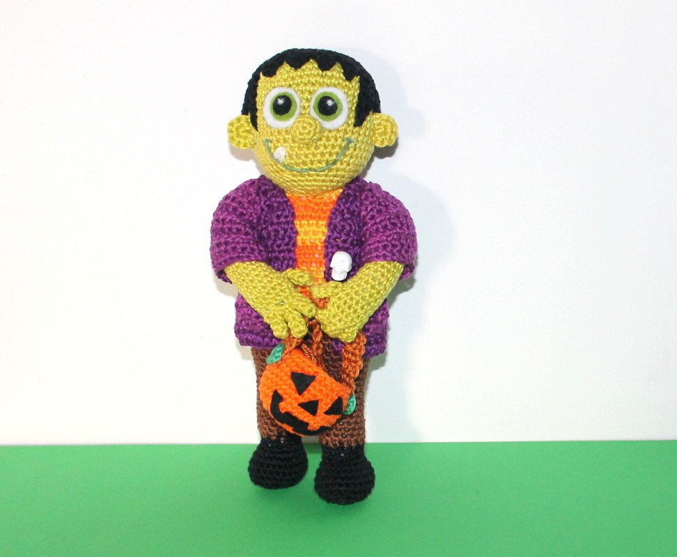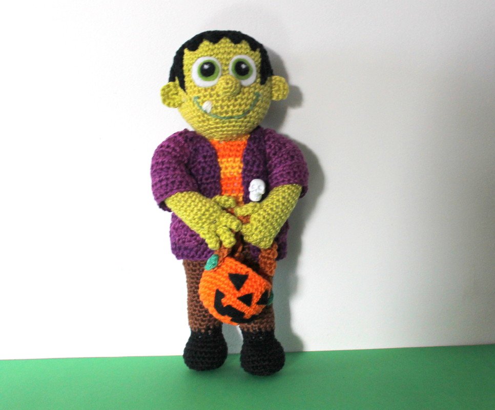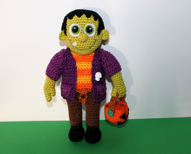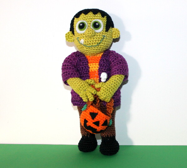 Frankenstein Junior hat sich schon sein Körbchen geschnappt und wartet darauf, dass er an Halloween Süßes oder Saures spielen kann. Dass ist nämlich sein absoluter Lieblingstag im Jahr. Da muß er sich nicht verstecken und jeder freut sich über sein tolles Kostüm.