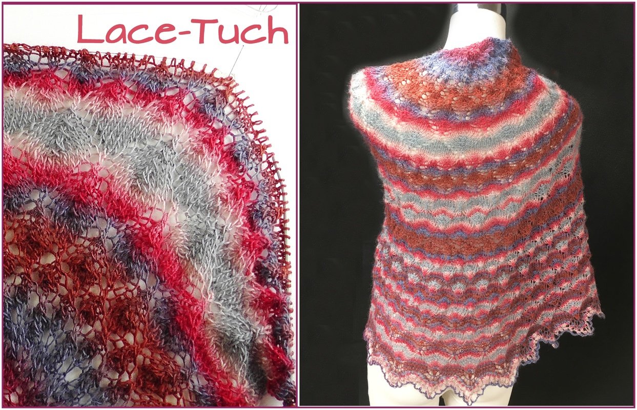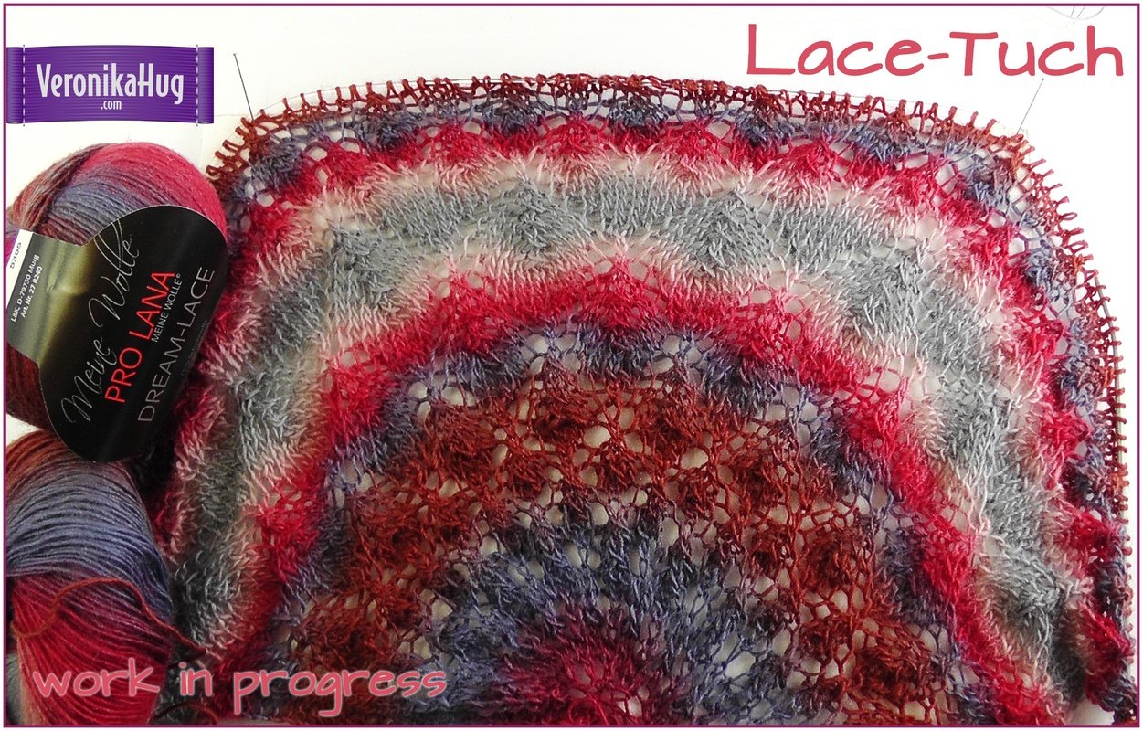 Material: 4 Knäuel (200 g) „Dream Lace“ (75% Schurwolle, 25% Polyacral, LL = 200 m/50 g) von Pro Lana, eine lange Rundstricknadel Nr. 3 – 3,5, eine Häkelnadel Nr. 3
