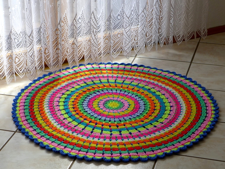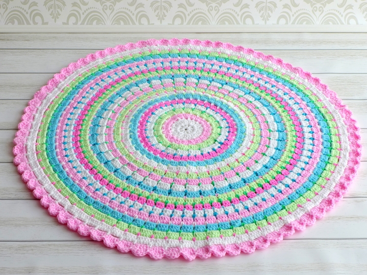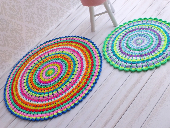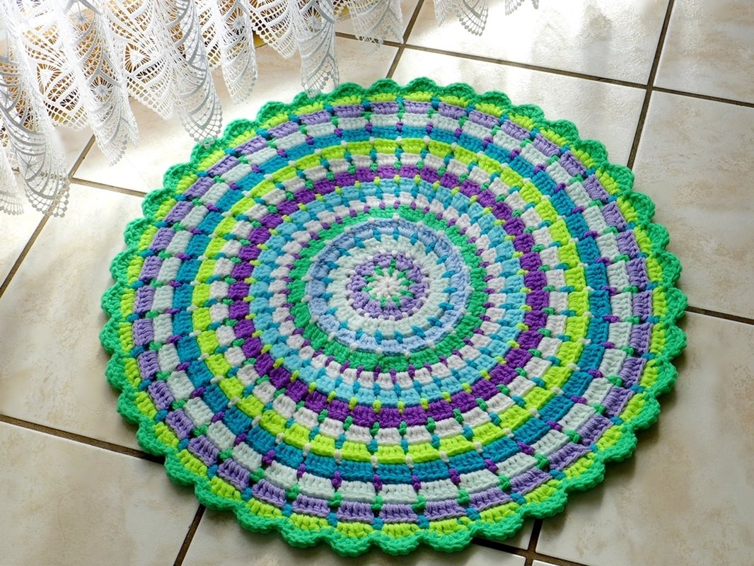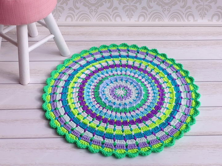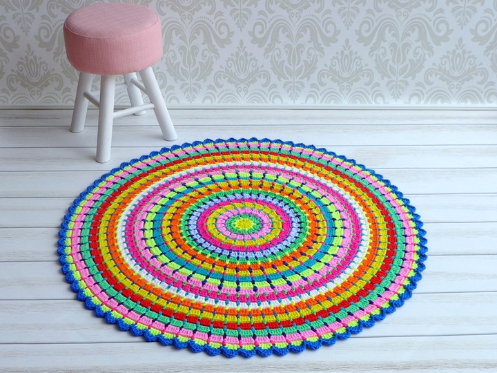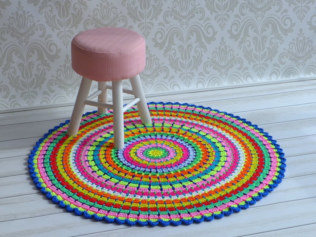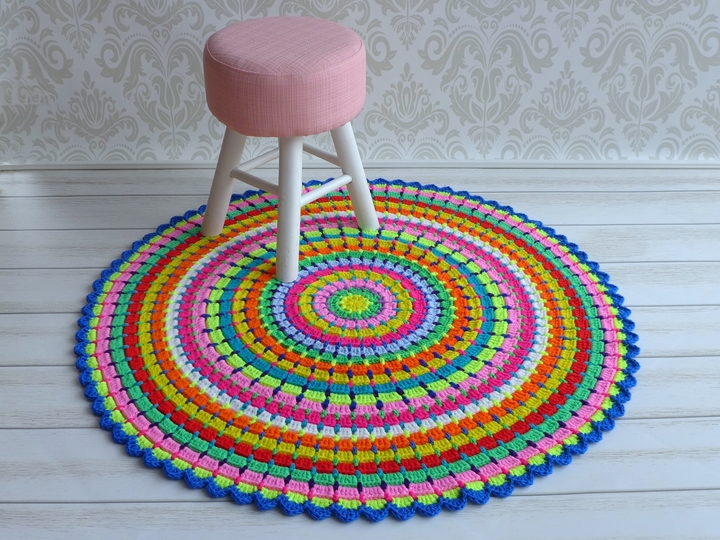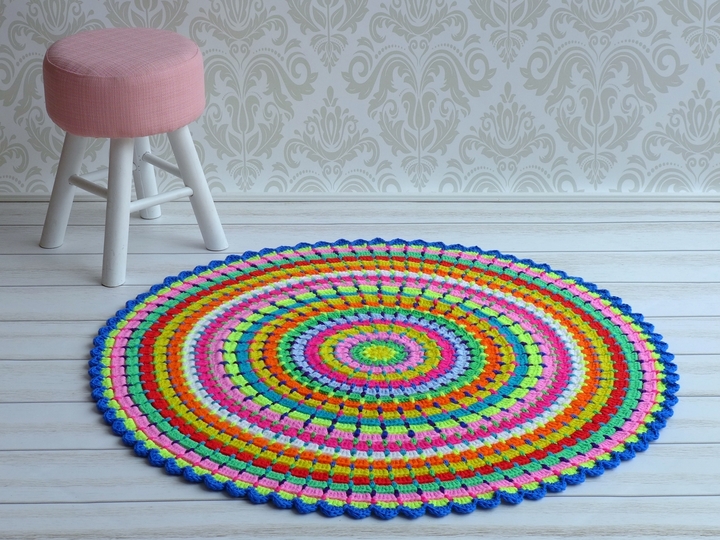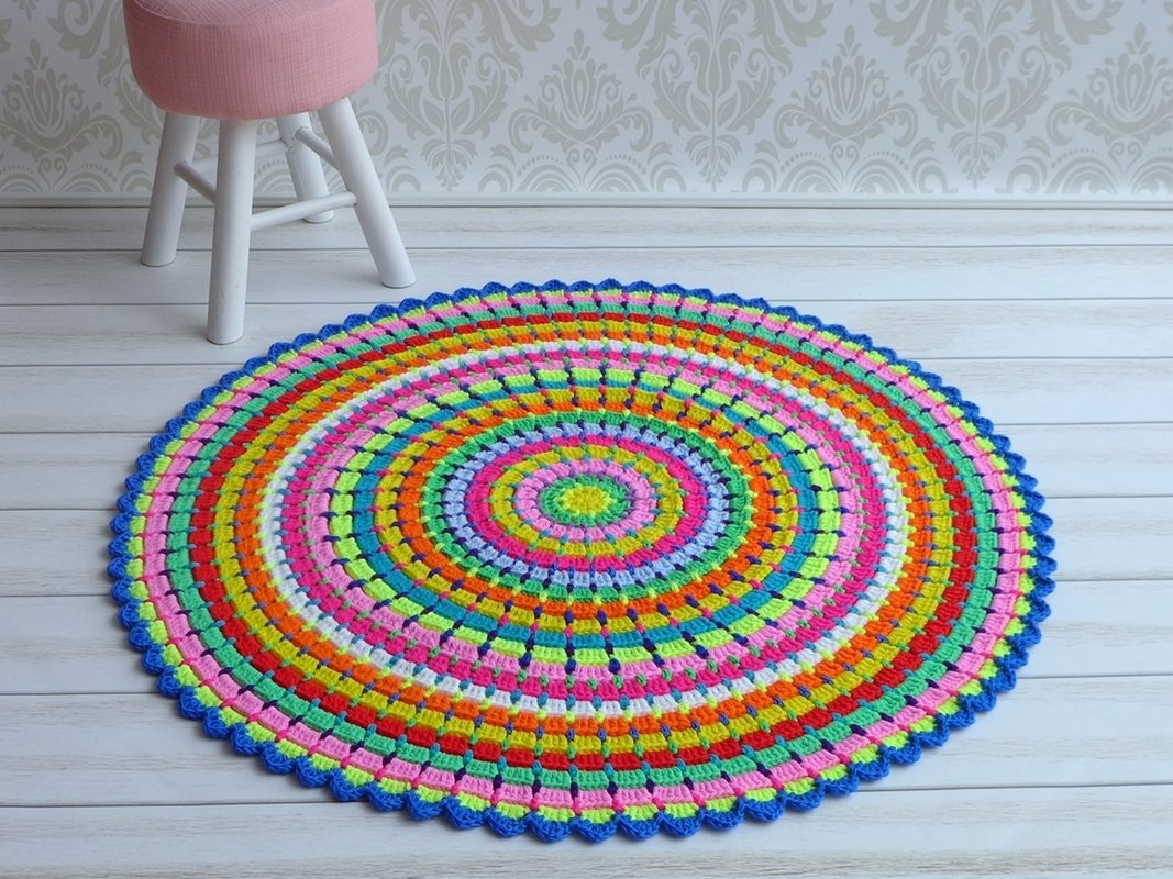 Häkeln Sie für Ihr Kind oder Enkelkind so einen schönen Teppich! Machen Sie daraus ein Gemeinschaftsprojekt: Tragen Sie alle Wollknäule zusammen und lassen Sie Ihr Kind mitbestimmen, welche Farben der Teppich Runde für Runde bekommen soll. Dann haben alle ihren Spaß, fiebern beim Entstehen mit und freuen sich später am gemeinsamen Werk.