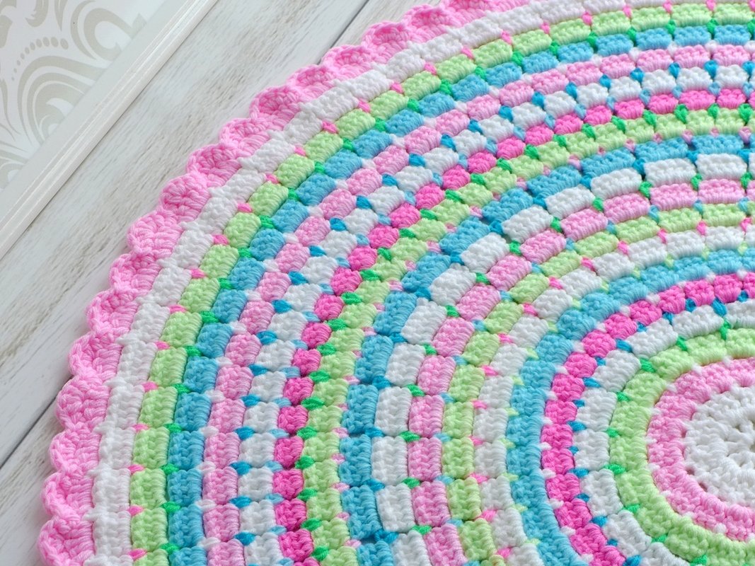 Dieser farbenfrohe gehäkelte Teppich macht sofort gute Laune und ist ein fröhlicher Blickfang in jedem Kinderzimmer. Ein idealer Teppich zum Draufspielen und sich wohlfühlen. Dabei ist er pflegeleicht, waschbar und rutschsicher.