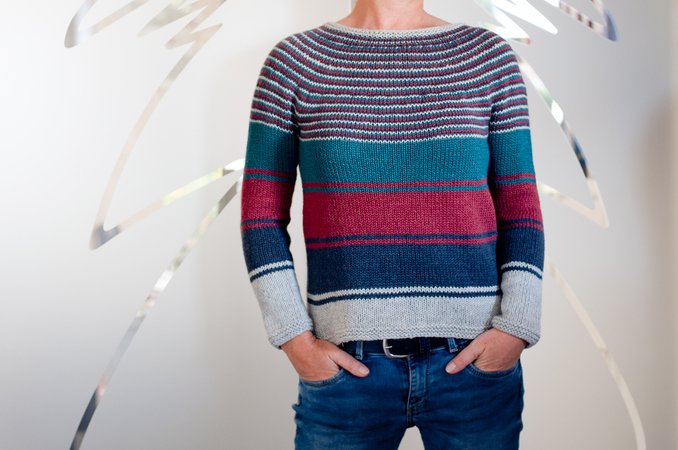 Strickanleitung für einen glatt rechts gestrickten Rundpassen-Pullover mit verschiedenen Streifenmustern. Ein perfektes Projekt auch für Strickanfänger!