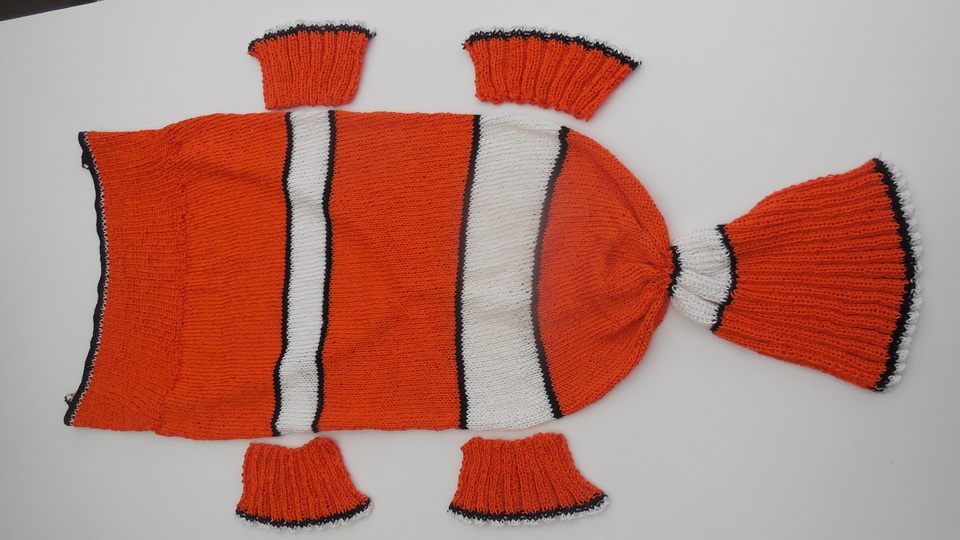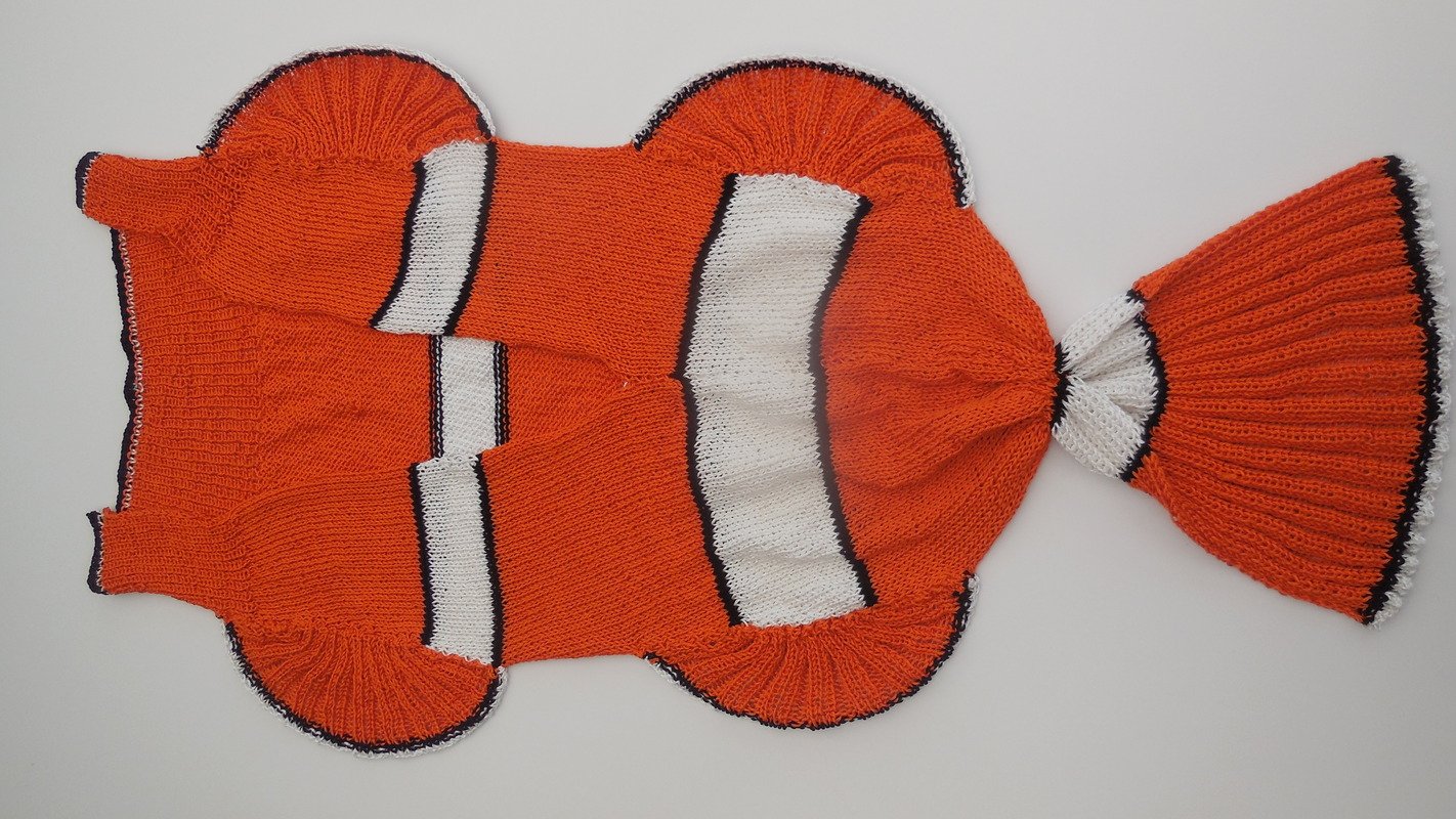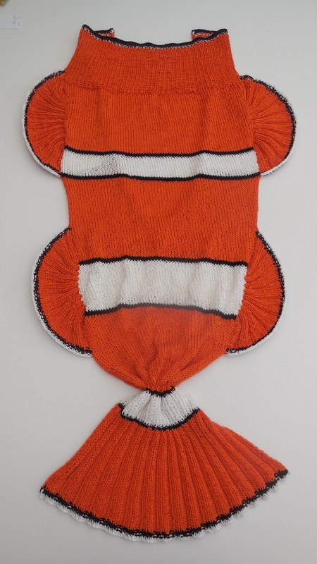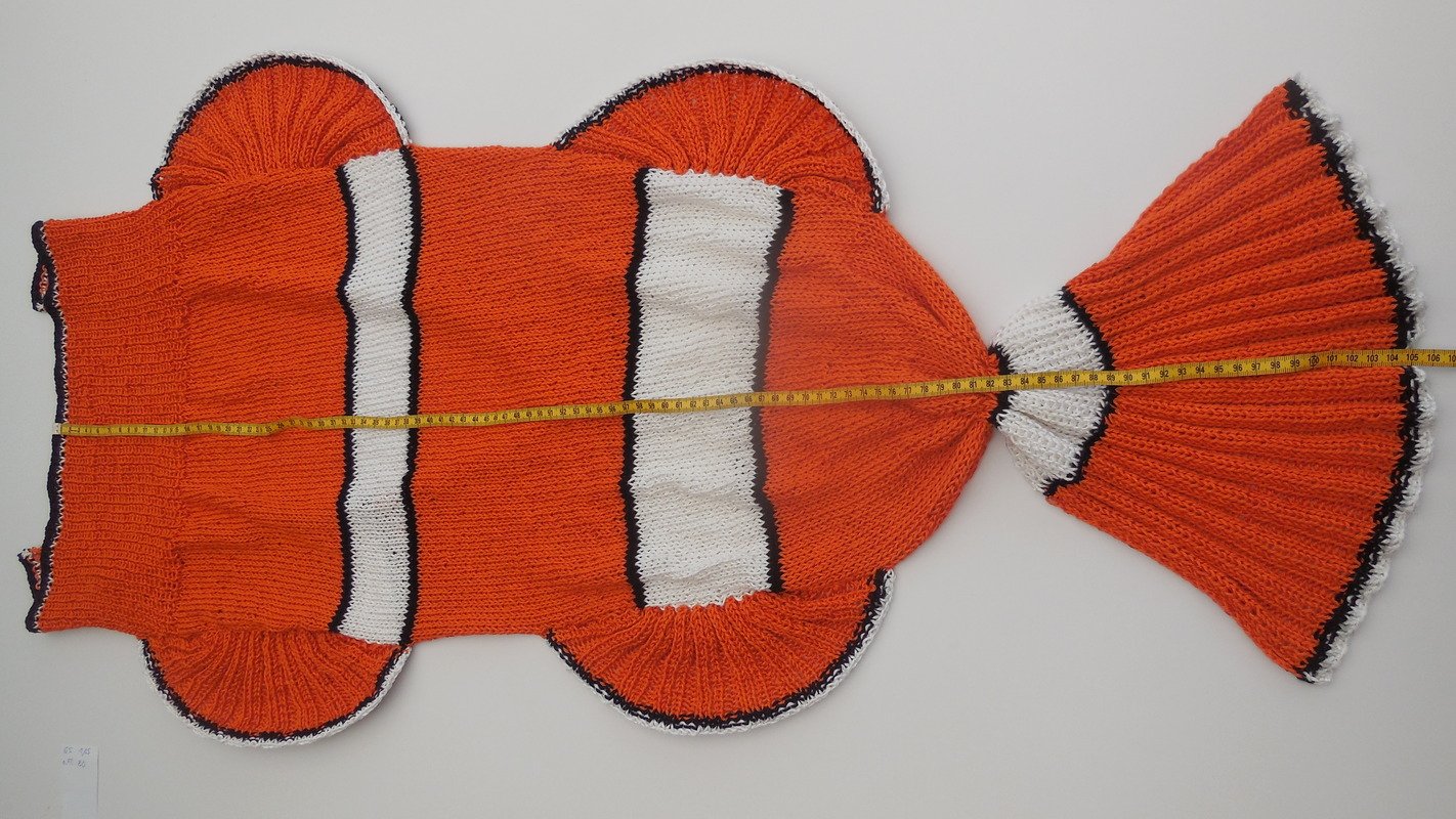 Meine Decke ist aus Wolle mit einer Ll von 85 m pro 50 g und einer Rundstricknadel Stärke 5 gestrickt. Dies ergibt dann eine Größe von 1,05 m Gesamtlänge. Ohne Flosse sind es 80 cm.