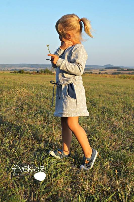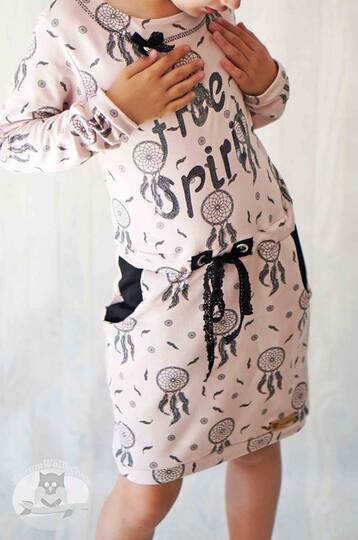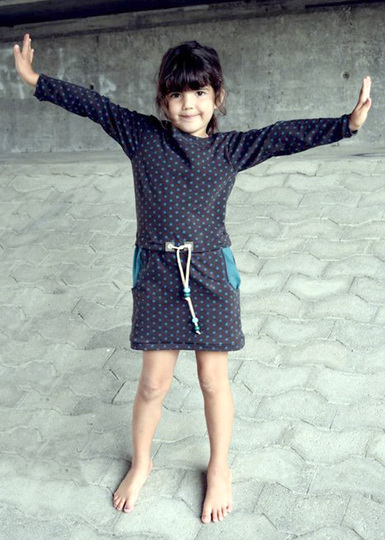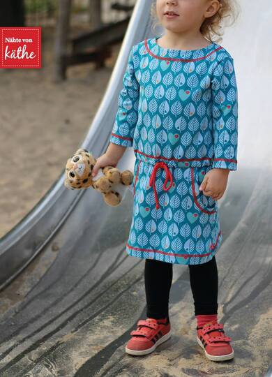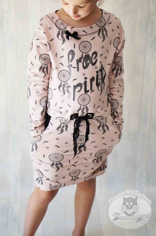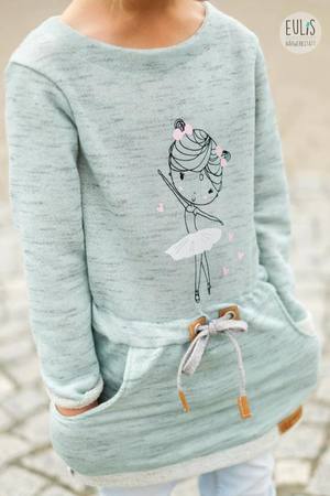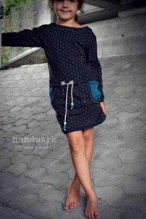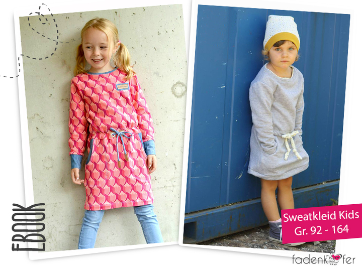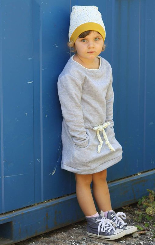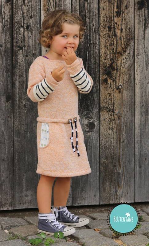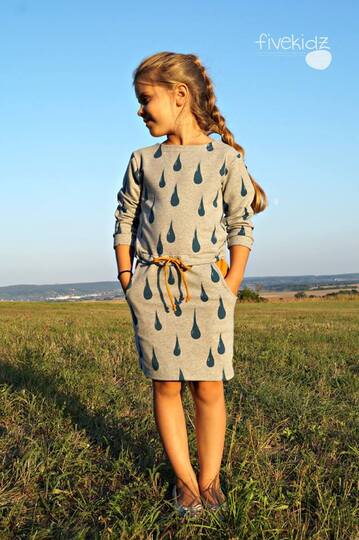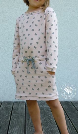 Das Sweatkleid ist lässig, sportlich und bequem. Es hat leicht überschnittene Schultern, einen Tunnelbund, den man mit Gummi oder Kordel gestalten kann.