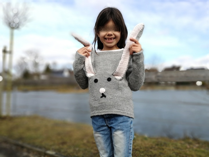 Knuddeliger Hasen Pulli "Hoppel", besonders schön warm und mit lustigen Hasen Gesicht.