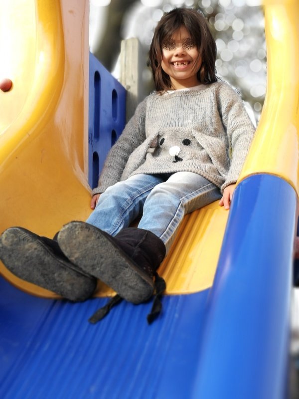 Der Pullover ist gestrickt, das Gesicht behäkelt.
