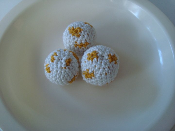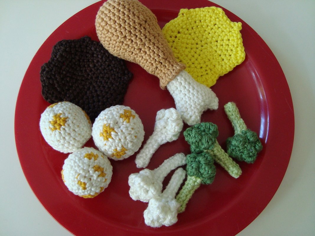 Ich biete hier eine selbstentworfene Anleitung zum Häkeln eines Menüs für die Kinderküche und/oder den Kaufladen, bestehend aus: