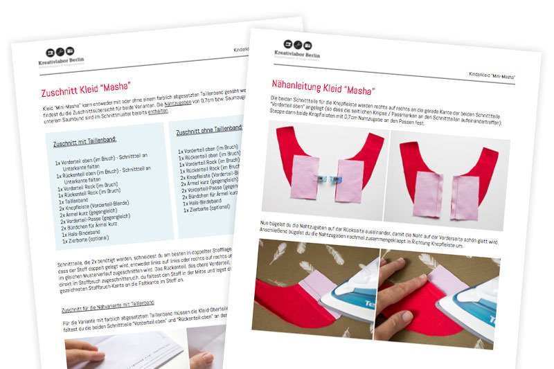 Das Schnittmuster “Mini-Masha” ist ausschließlich für dehnbare Stoffe konzipiert. Zum Nähen eignen sich Jersey- stoffe, aber auch dünne Sweatstoffe oder zarte Strick- und Spitzenstoffe. Neben dehnbaren Stoffen benötigst du für das Kleid “Mini-Masha” bei sehr dünnen Stoffen für die kleine Knopfleiste ein Bügelvlies (z.b. H200) und außerdem 2 - 3 Knöpfe oder Druckknöpfe.