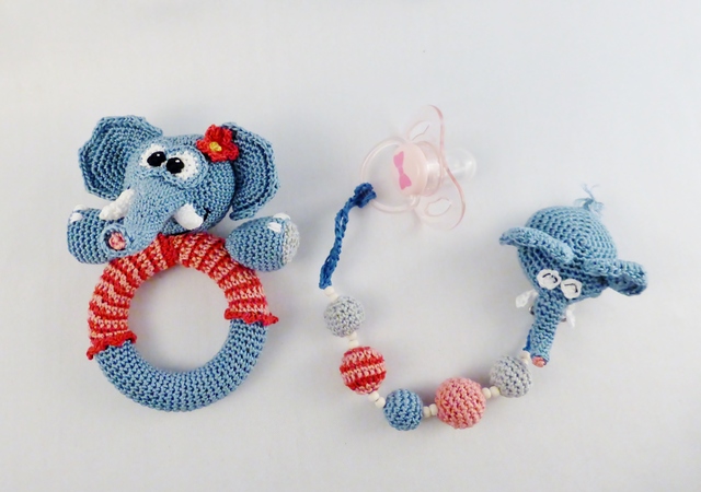 Jetzt kannst du sparen im Doppelpack! Die Anleitungen sind verständlich und detailliert Runde für Runde beschrieben sowie reich bebildert. Somit kannst du ganz einfach eine Baby Rassel sowie die Schnullerkette mit Elefantenmotiv von der Hand zaubern. Die Anleitungen sind inkl. Angaben und Bilder zu Material sowie Erläuterungen zu den Abkürzungen, so dass die Baby Rassel und Schnullerkette auch von Anfängern nachgehäkelt werden können.
