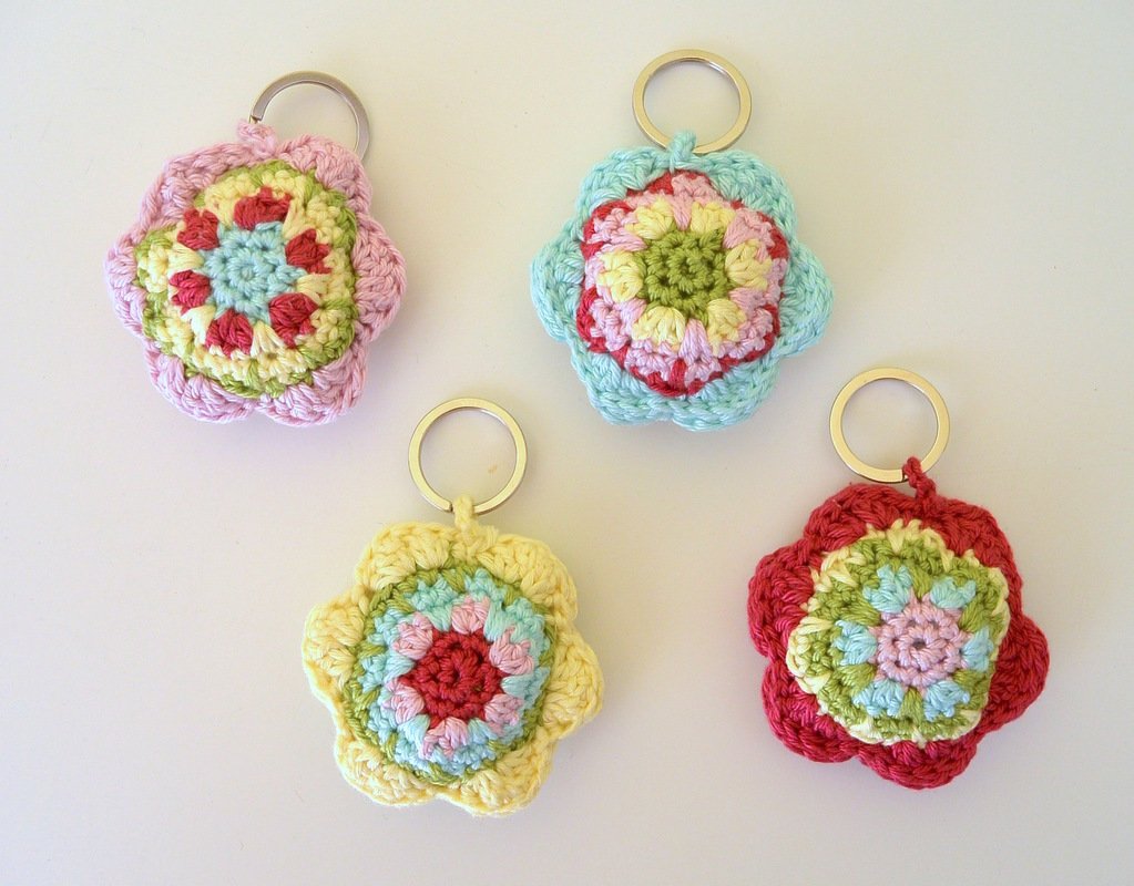 ... diese bunten Schlüsselanhänger (ca. 6 cm) sind aus ein paar Wollresten schnell gehäkelt und ein schönes Mitbringsel....