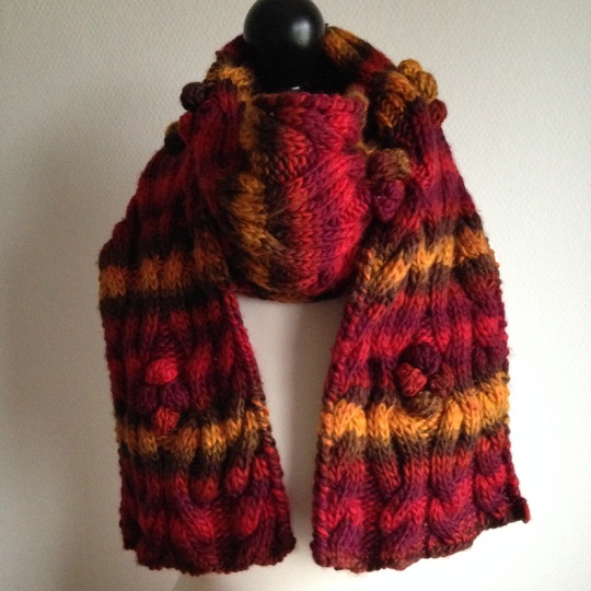 Langer, bunter Schal in tollen rot-senf Tönen in einem aufwendigen Zopfmuster mit Noppen gestrickt. Der Schal hat eine Länge von 205 cm und eine Breite von ca. 17 cm. Das Muster ist anspruchsvoll und somit für Anfänger nciht geeignet.