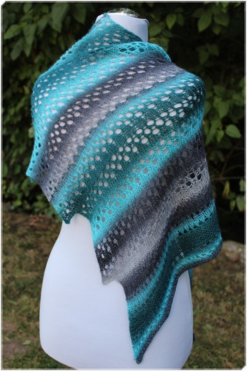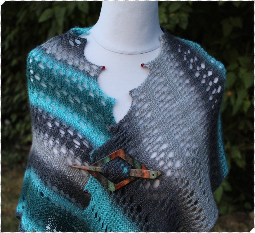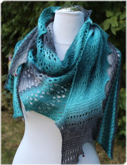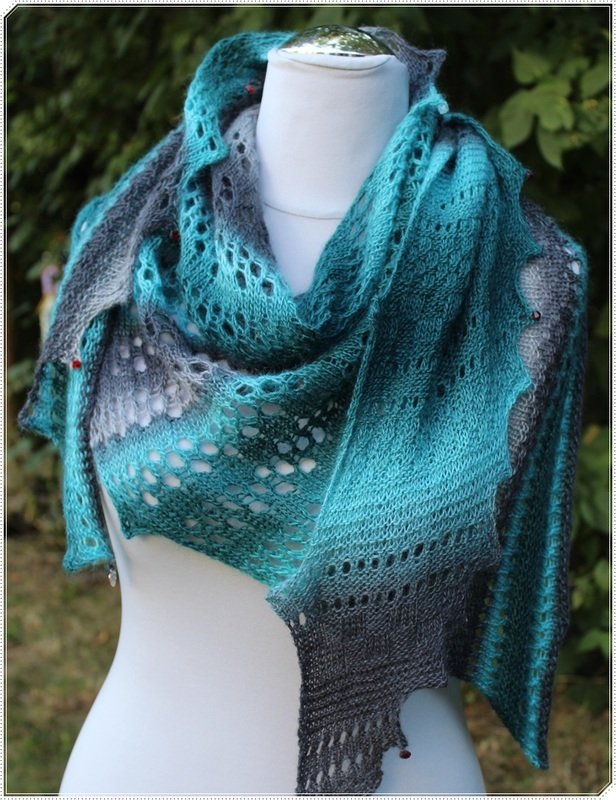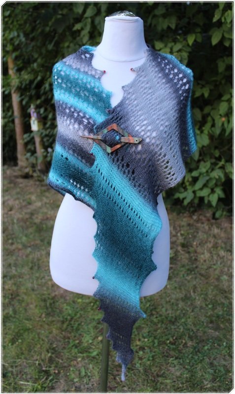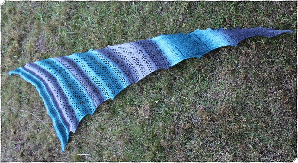 Die Namensfindung für dieses kleine Dreieckstuch war recht leicht. Der Farbverlauf hat mich ganz einfach inspiriert. Ein Wechselspiel zwischen blau und grau ließ nur einen Schluss zu, denn dieses hatte so viel Ähnlichkeit mit den Farben eines kleinen Wasserfalls. Die grauen Steine, die sich aus dem Wasser erheben und das blaue Wasser, das zwischen ihnen hindurchläuft, brachten mich auf die Idee. Deshalb auch der zackige bzw. wellige Rand, der dem Ufer eines Wasserfalls gleicht.