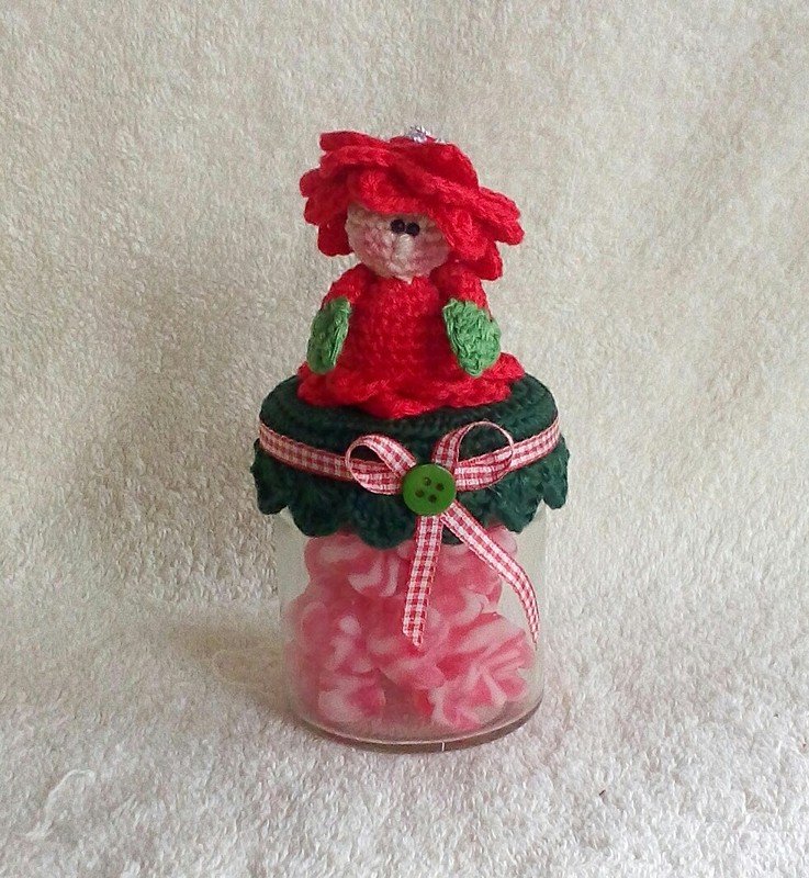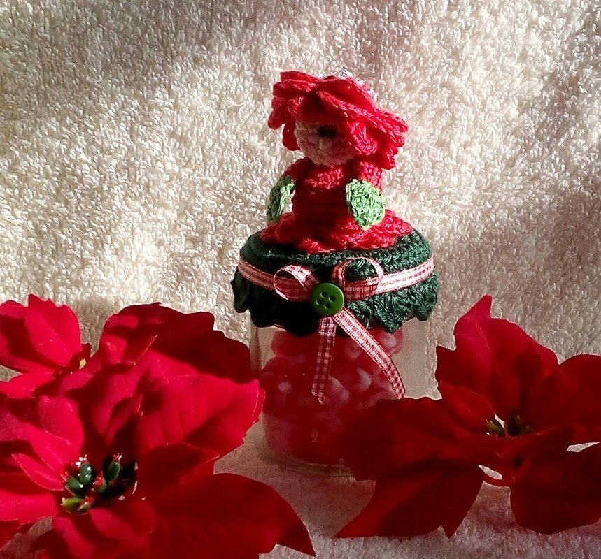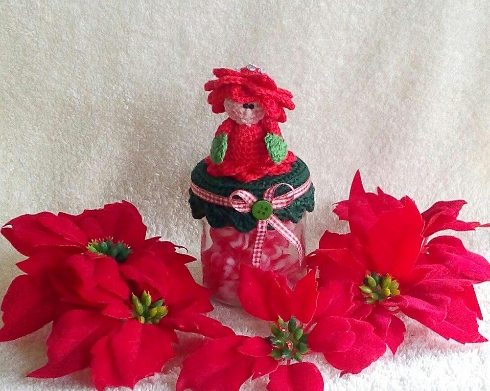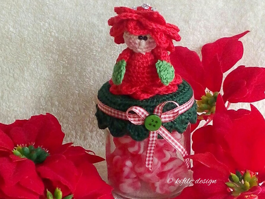Wenn du Mrs. Poinsettia mit Häkelnadel Nr2 und Baumwollgarn 50 gr/125 m arbeitest, wird er 6 cm groß Weiters wird noch Füllwatte , Nadel , Schere und eventuell Heisskleber benötigt